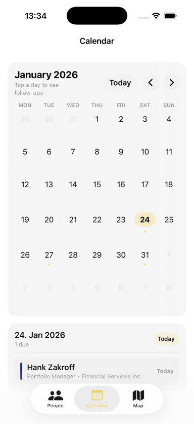 Visualisez tous vos rappels dans un calendrier clair et intuitif. Touchez une date pour voir immédiatement les contacts à recontacter et accéder à leur fiche. Le bouton Today vous ramène à aujourd’hui en un instant.
