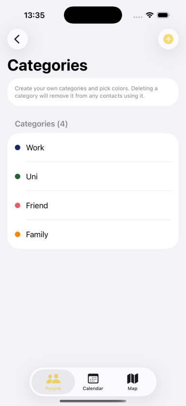 Classez vos contacts grâce à des catégories et des couleurs personnalisées (travail, amis, famille, etc.). Ajoutez, modifiez ou supprimez des catégories pour garder une organisation claire et adaptée à vos besoins.