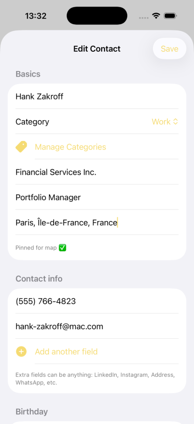 Créez ou mettez à jour une fiche contact complète : nom, entreprise, poste et localisation. Ajoutez les informations essentielles (téléphone, email) ainsi que des champs personnalisés comme LinkedIn, WhatsApp ou une adresse.